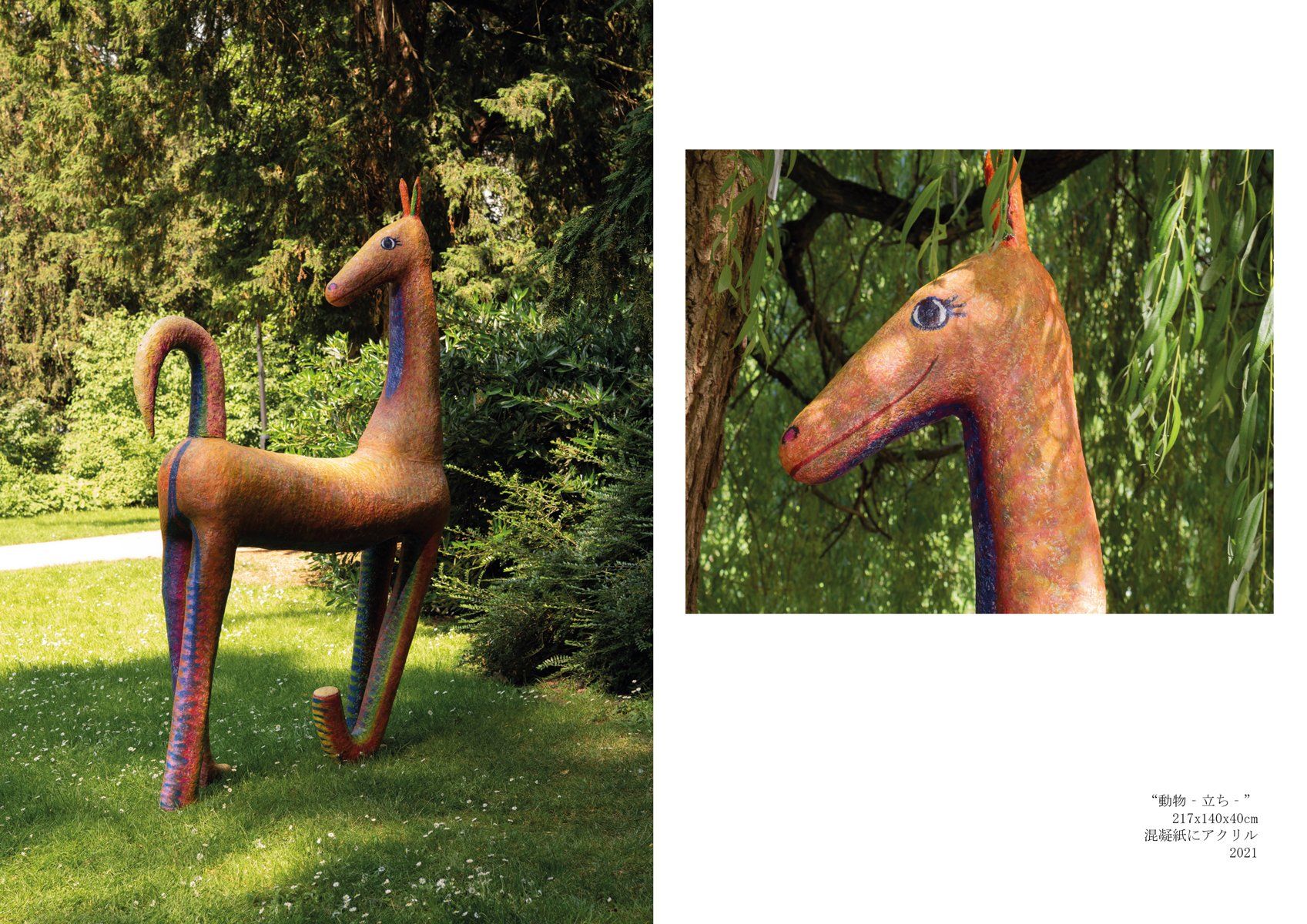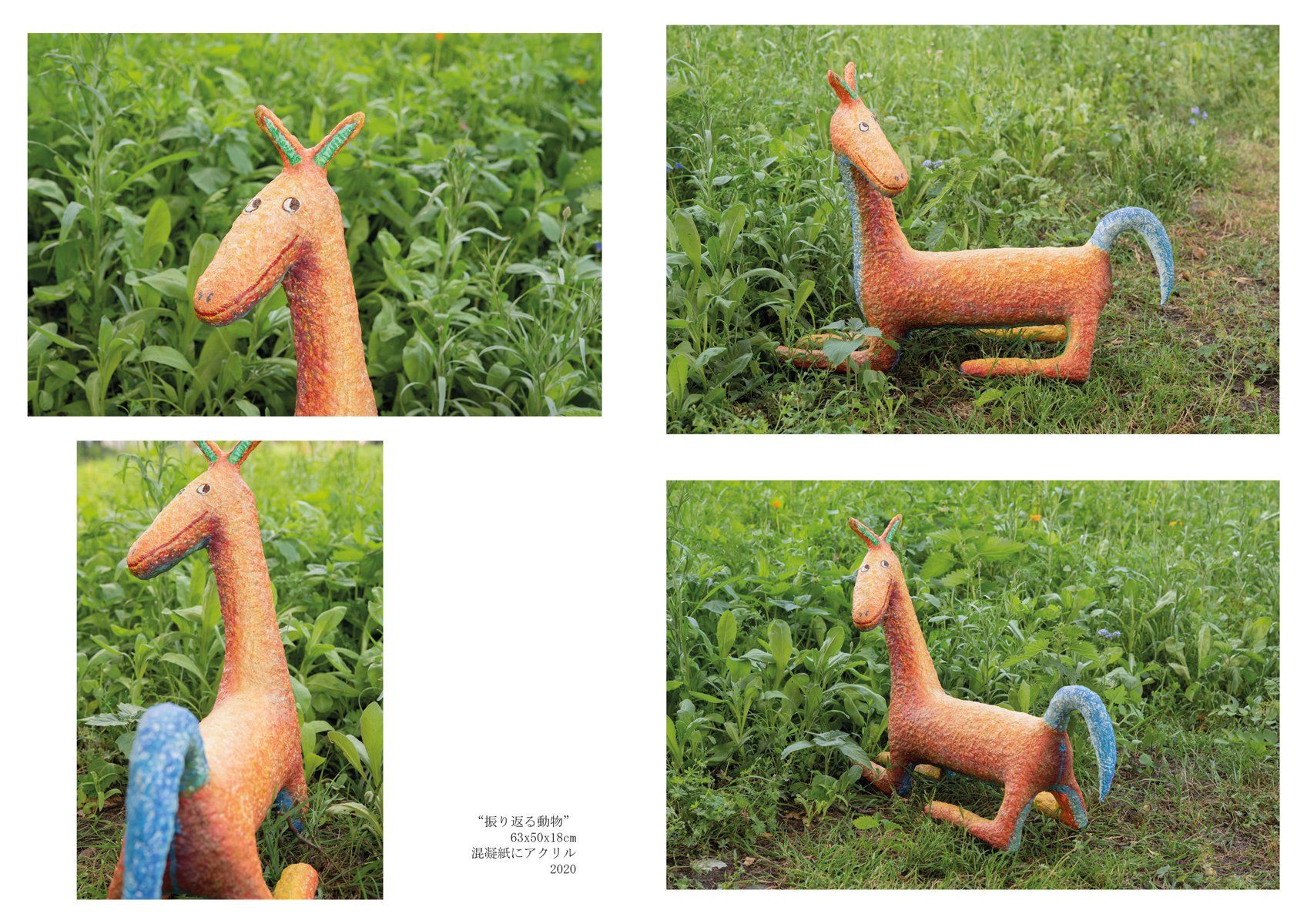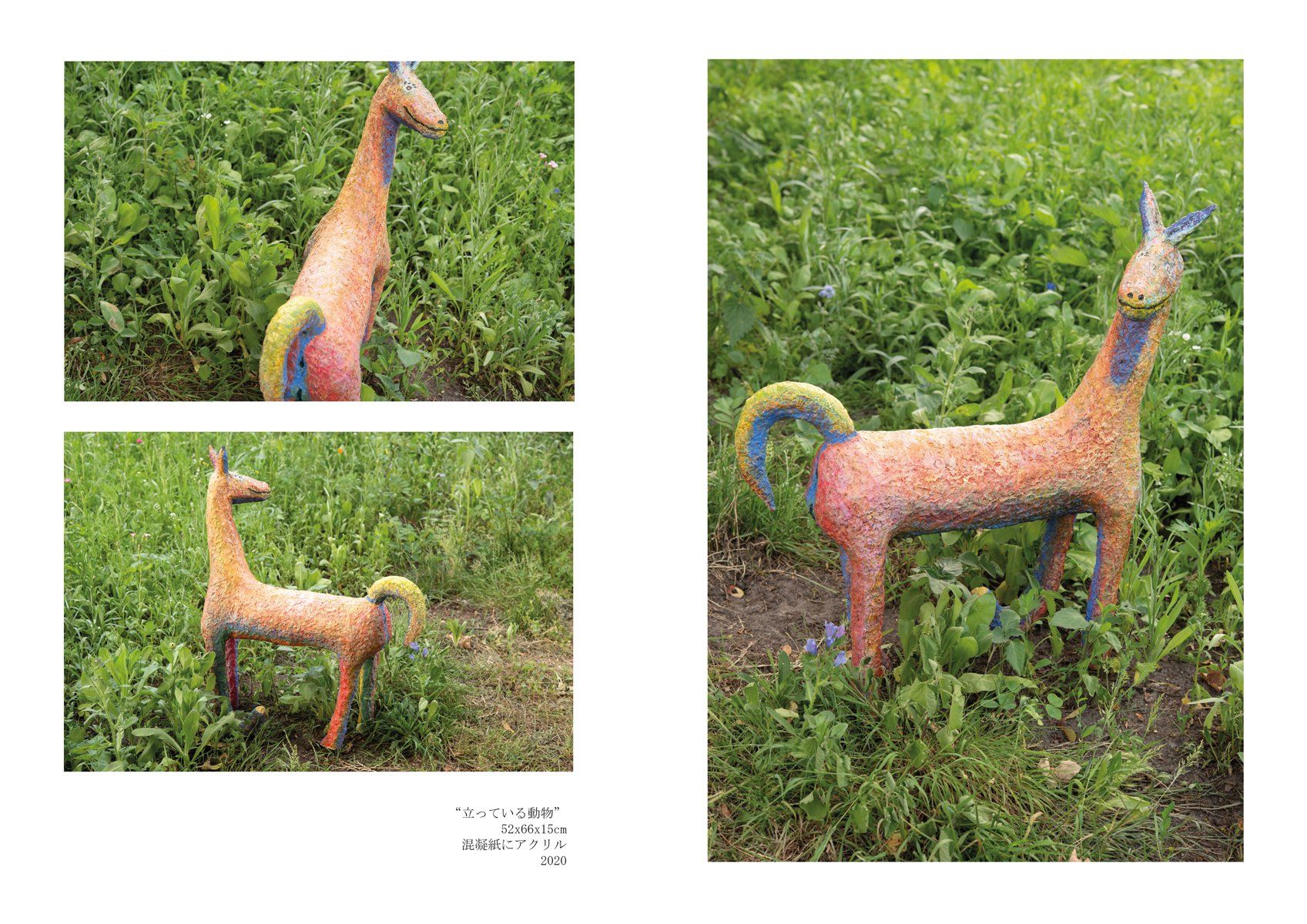 この経験をきっかけに、どのようにしたら野外に絵画を展示できるのかを考えはじめました。どのようにしたら、野外に絵を飾るだけではない展示が出来るのか考えたとき、動物や人物が私の作品にとって重要なテーマであることから、絵の中に描いているモチーフを三次元にし、自然の中にインスタレーションしてみようと思いました。