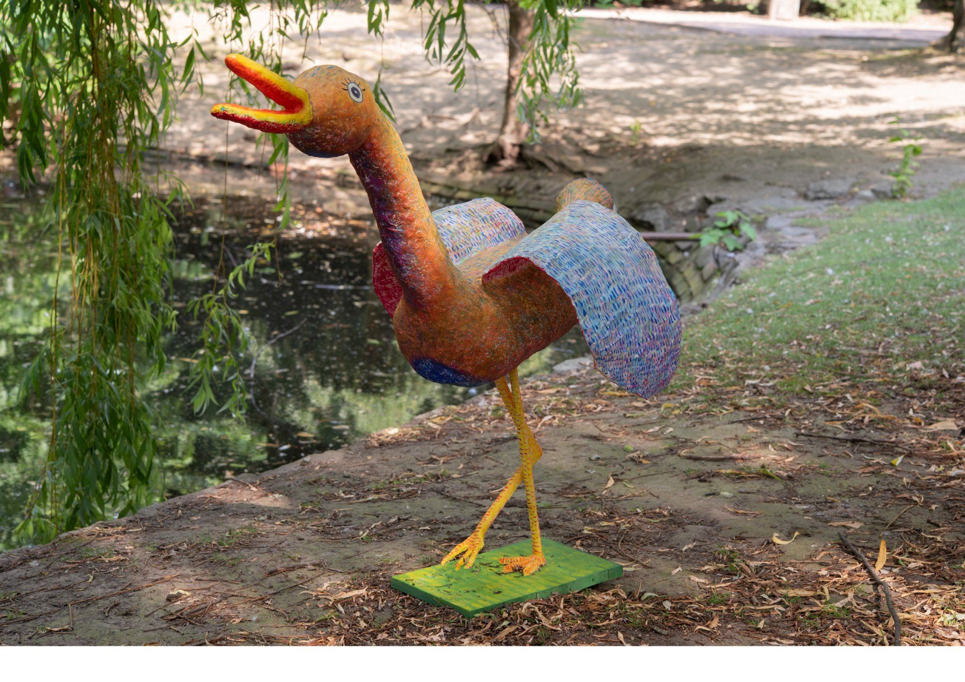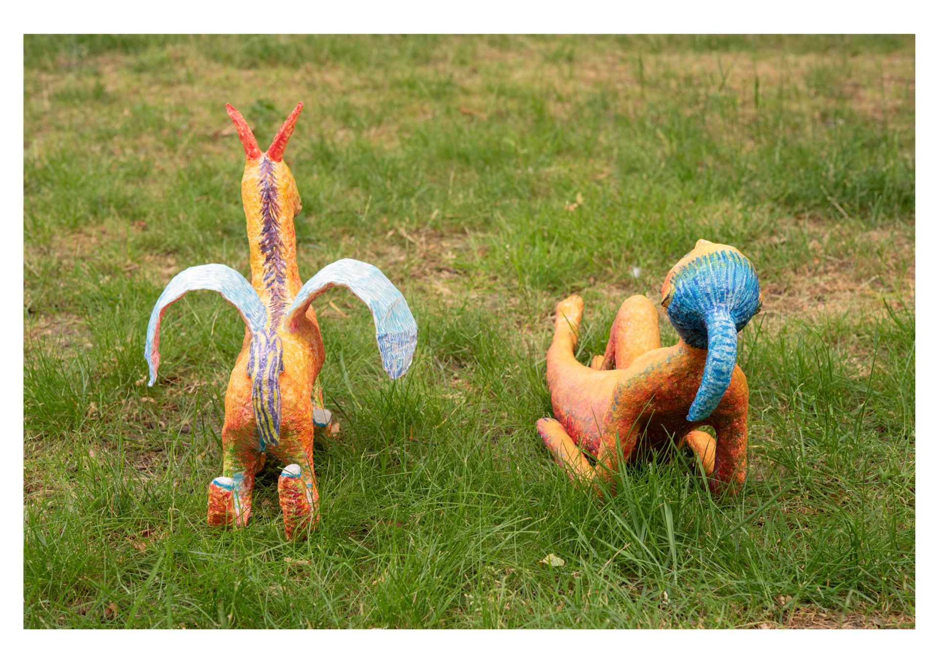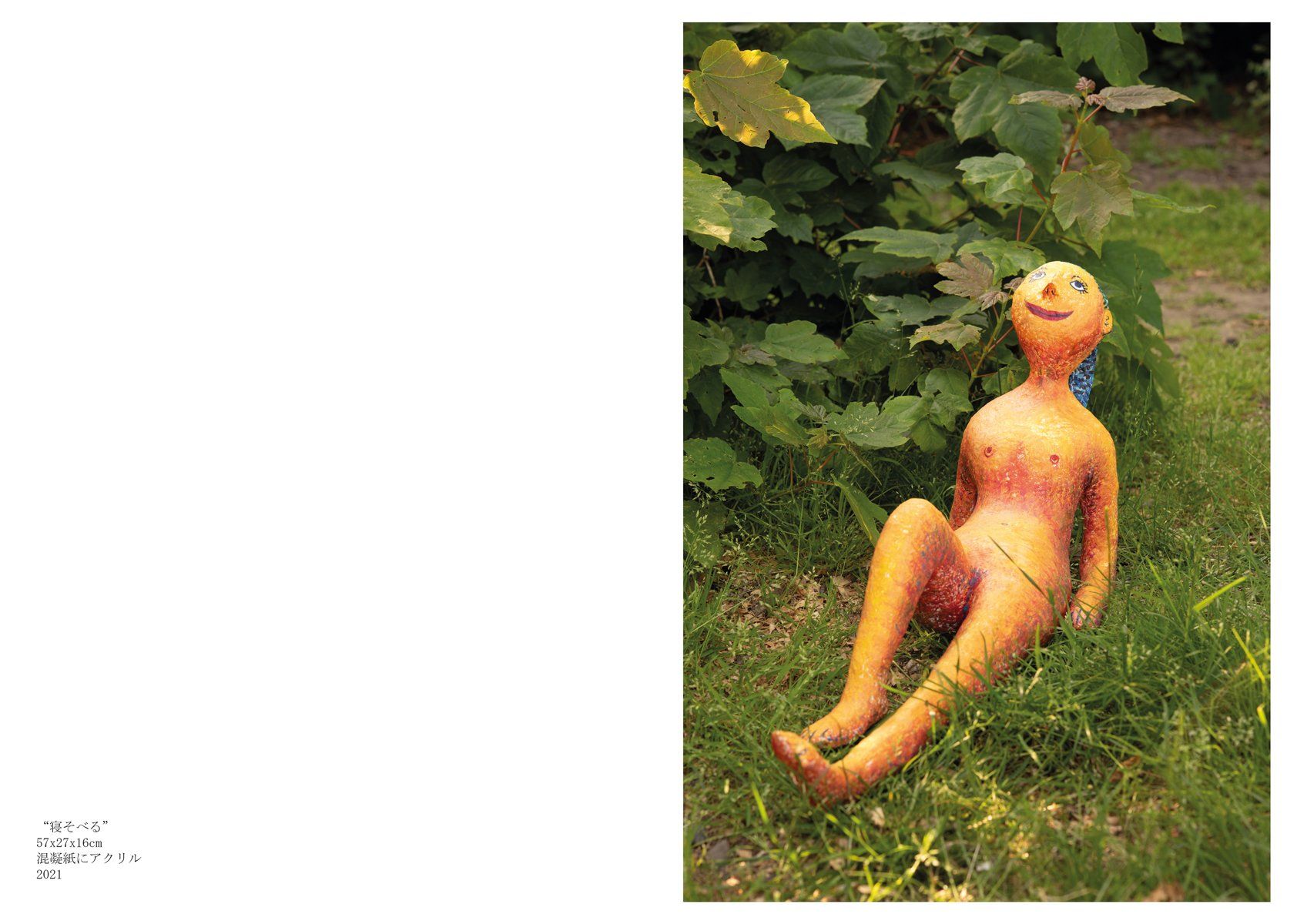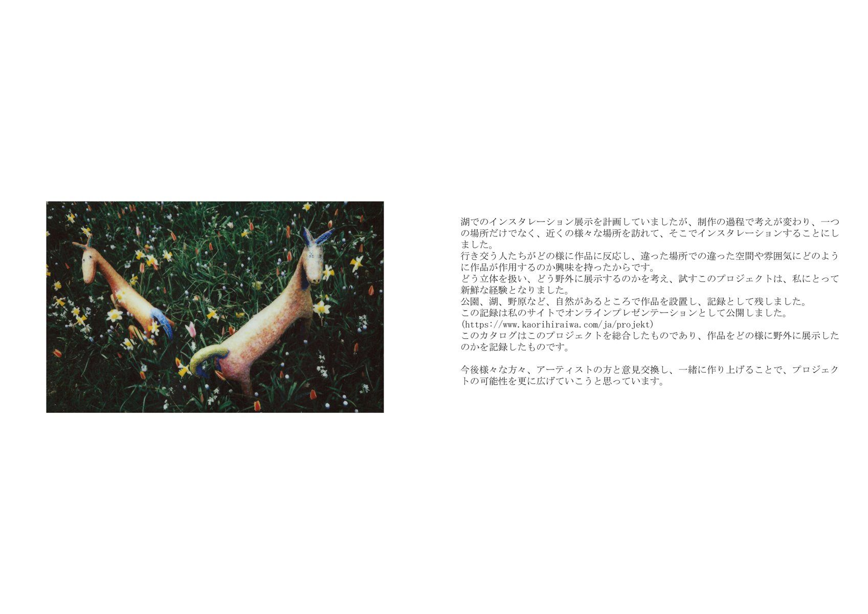 この経験をきっかけに、どのようにしたら野外に絵画を展示できるのかを考えはじめました。どのようにしたら、野外に絵を飾るだけではない展示が出来るのか考えたとき、動物や人物が私の作品にとって重要なテーマであることから、絵の中に描いているモチーフを三次元にし、自然の中にインスタレーションしてみようと思いました。